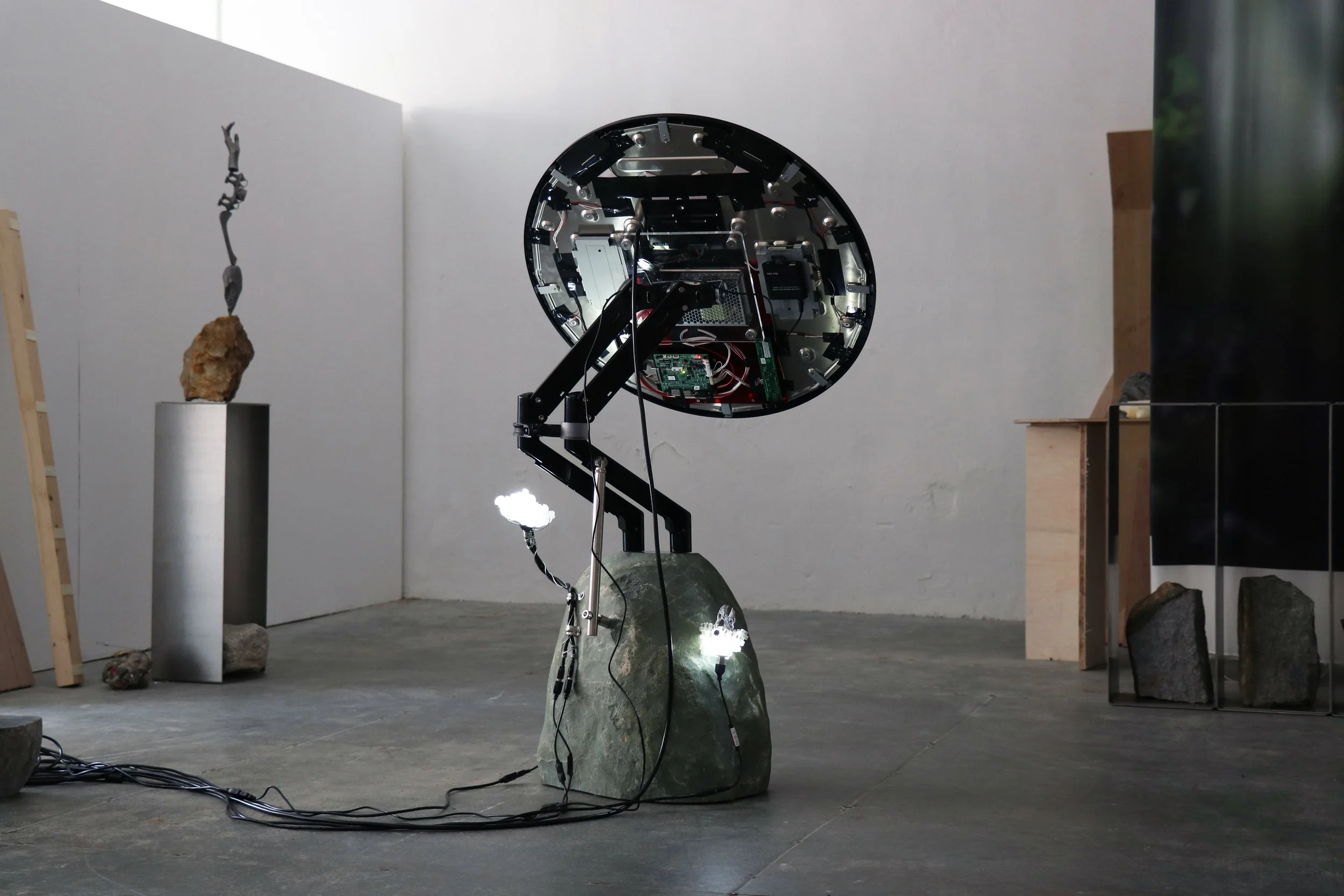 F10W3R is a physical-digital assemblage sculpture created in collaboration with digital artist Henry Chu. Presented at the world’s first Digital Art fair in 2022, the piece comprises an animated abstract flower on a circular display with exposed electronics mounted to raw green marble.